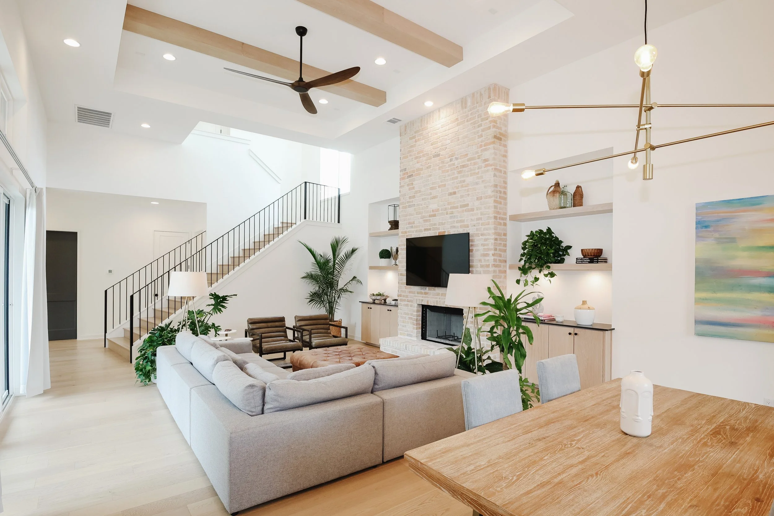 Contemporary design features include huge corner-cut casement windows that provide a ton of bright natural light, European white oak flooring, 14’ recessed ceilings with white oak beams, Austin Commons brick fireplace, custom cabinets and white oak built-ins, quartz and Calcutta marble countertops with quartz and Ann Sacks tile backsplashes, and Delta fixtures throughout.